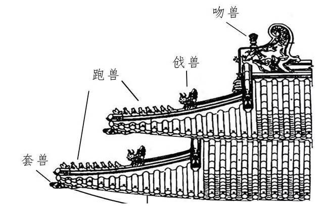 其中,正脊上安放吻兽或望兽,垂脊上安放垂兽,戗脊上安放戗兽,另在屋脊边缘处安放仙人走兽。